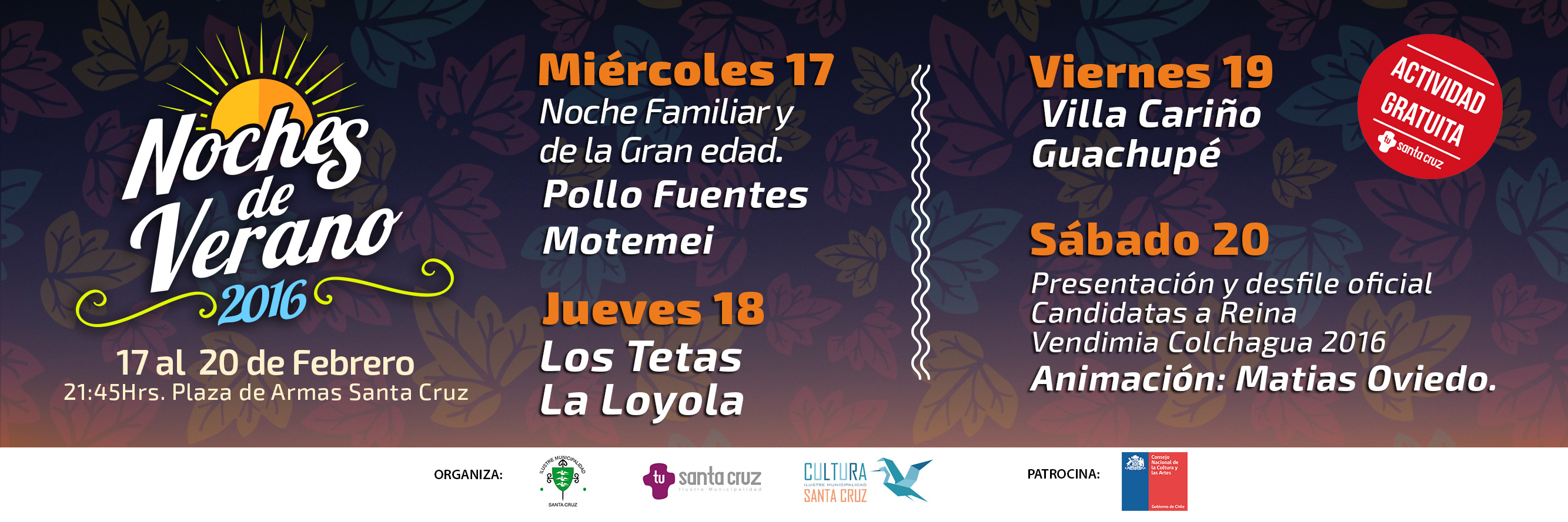 El Departamento de Cultura y Turismo del municipio de Santa Cruz, esta trabajando y preparando los detalles para la imperdible fiesta familiar. El día de apertura se presentará el grupo “Motemei”, quienes tocarán clásicos del rock y baladas, mientras que el cierre de aquella noche lo hará José Alfredo “Pollo” Fuentes, quién interpretará sus mejores temas.