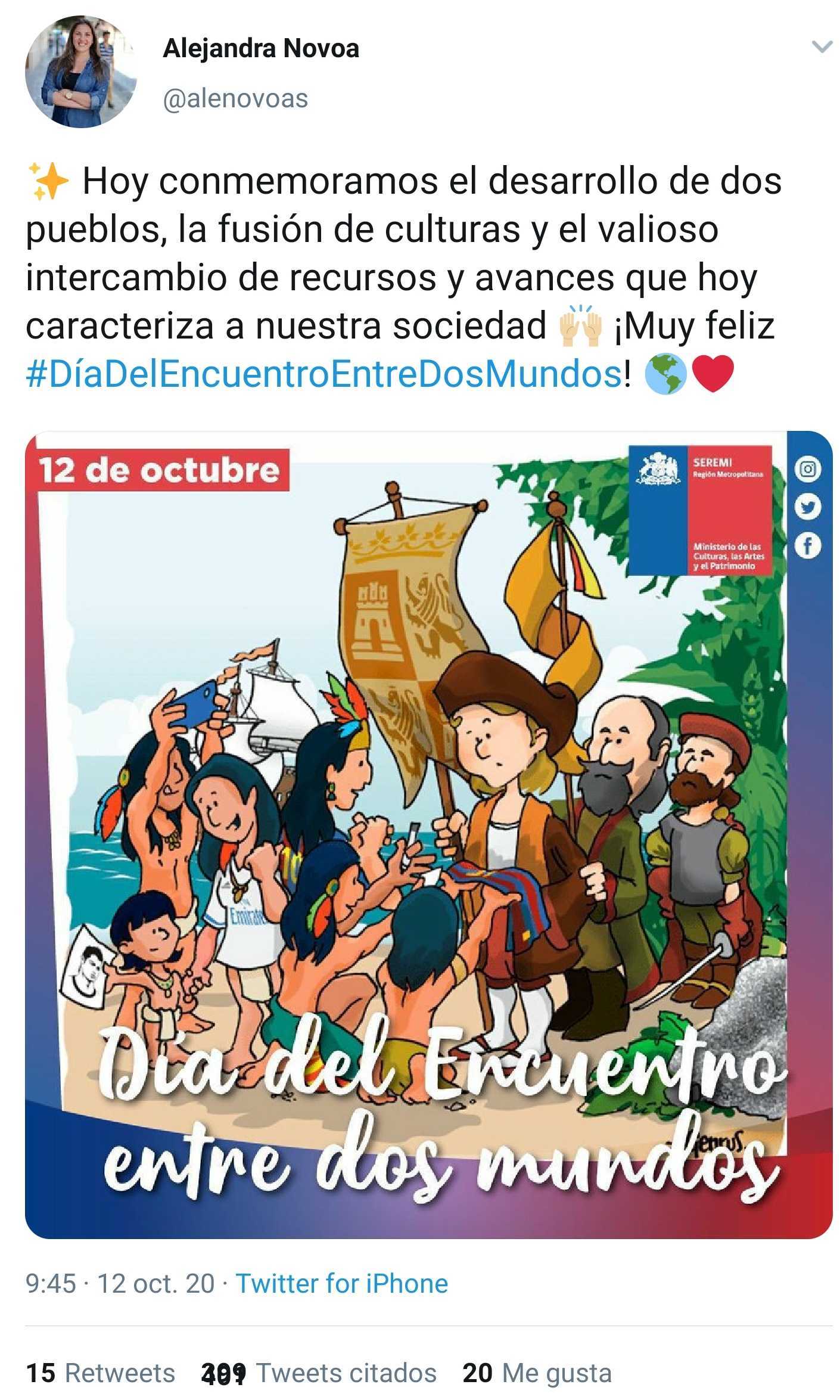 Este lunes, a raíz de la conmemoración de la llegada de Cristóbal Colón a América, la seremi de Culturas de la Región Metropolitana, Alejandra Novoa, publicó una polémica imagen para celebrar la fecha.