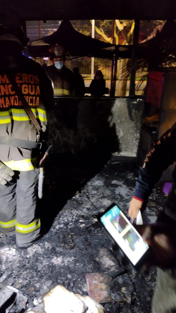 Una vez activada la alarma de incendios, concurrió personal de Bomberos y de la 1ra. Comisaría Rancagua. Tras controlar las llamas se pudo comprobar que el fuego destruyó el interior de la oficina quemándose documentación, escritorios, artículos de oficina y computadores.