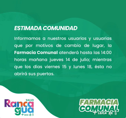 La atención habitual de la Farmacia Comunal de Rancagua será suspendida a partir de este jueves a las 14.00 horas, de acuerdo a lo anunciado por el municipio.