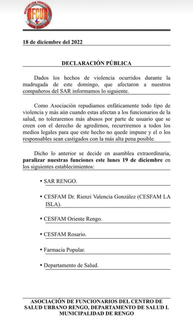 Debido a hechos violentos ocurridos durante la madrugada del domingo en las dependencias del SAR, la Asociación de Funcionarios de la Salud de Rengo decidió paralizar sus actividades este lunes 19 de diciembre en distintas dependencias municipales, manteniendo turnos éticos para garantizar las atenciones de emergencia.