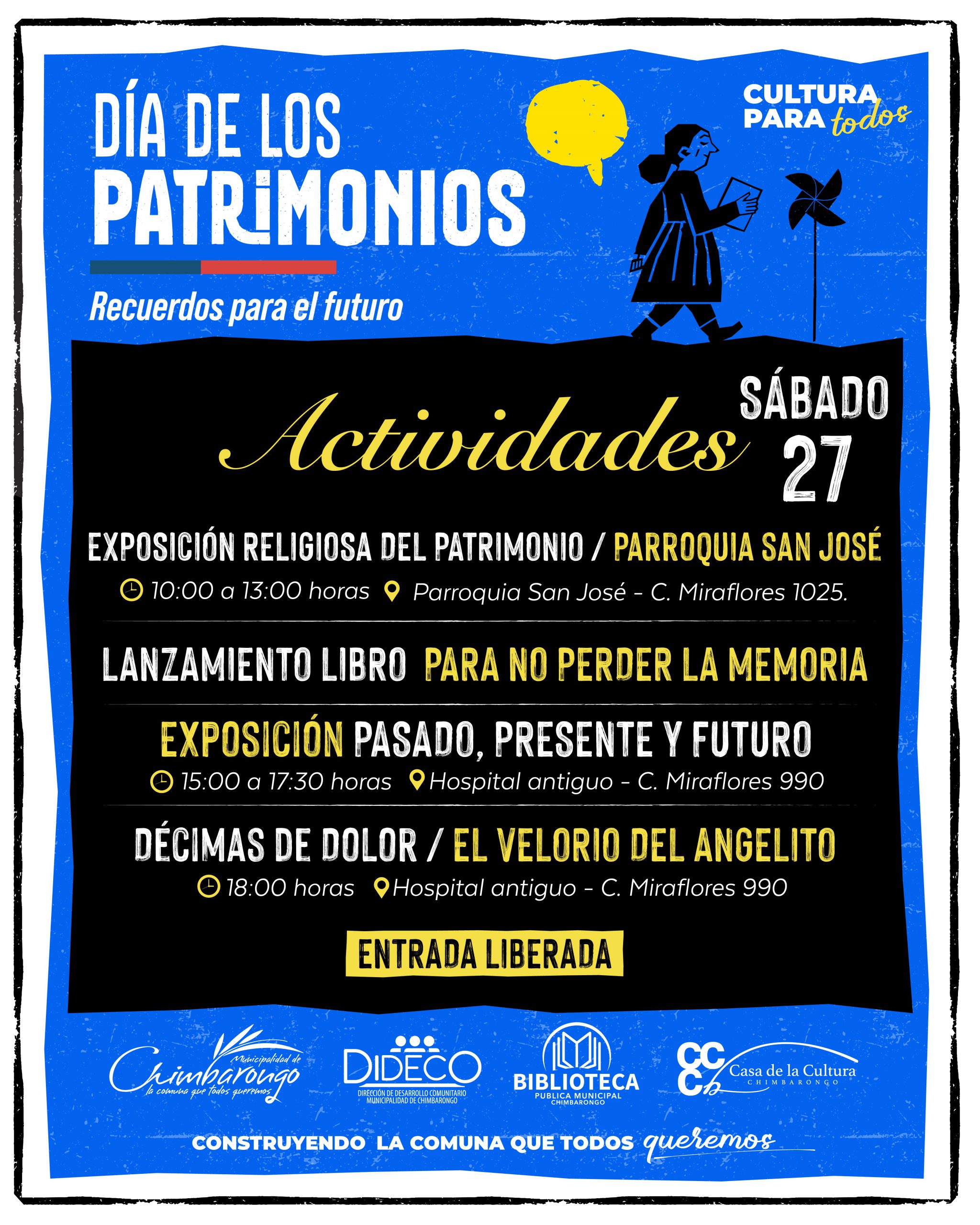 Tendremos el lanzamiento del libro fotográfico “Para no Perder la Memoria”, compilado de autoría del profesor Miguel Lira Muñoz; la exposición religiosa del Patrimonio en Iglesia San José de 10 a 13 horas; la obra “Décimas de dolor”: velorio del angelito, a las 18.30 horas en el Hospital Antiguo de Chimbarongo, y, en este mismo lugar, también se desarrollará la Exposición Pasado, presente y futuro, de 15 a 17.30 horas.