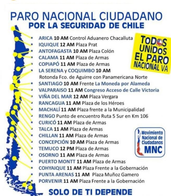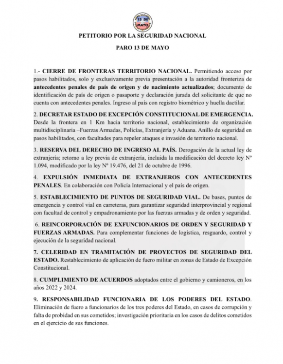 En detalle, el petitorio apunta nueve demandas: Cierre de fronteras territorio nacional, decretar Estado e Excepción Constitucional de Emergencia, reserva del Derecho de Ingreso al País, expulsión inmediata de extranjeros con antecedentes penales, establecimientos de puntos de seguridad vial, reincorporación de ex funcionarios de orden y seguridad y Fuerzas Armadas, celeridad en tramitación de proyectos de seguridad del Estado, cumplimiento de acuerdos y responsabilidad funcionaria de los poderes del Estado.
