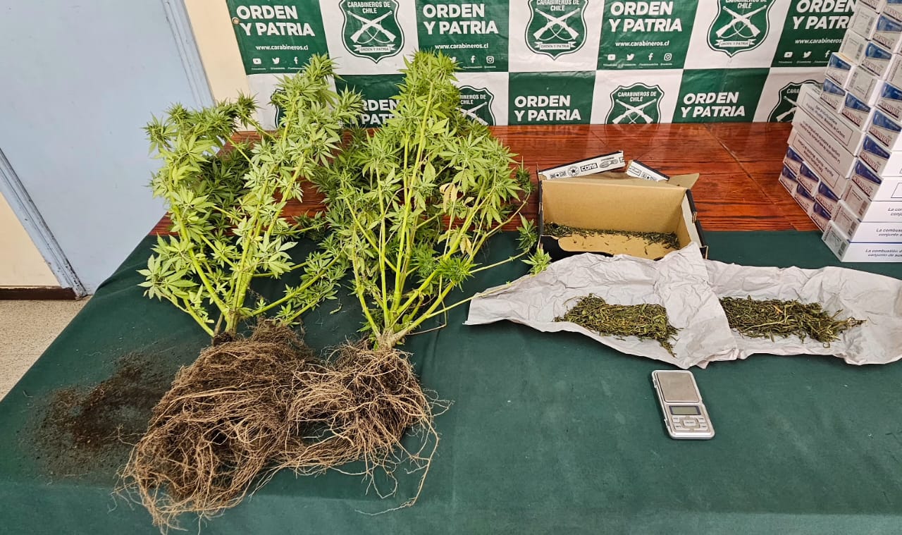 En el interior del inmueble se encontraron dos plantas de cannabis sativa, 35 gramos de marihuana elaborada, una pesa digital y 1.480 cajetillas de cigarrillos de diversas marcas, elementos que fueron remitidos al Servicio de Salud y al Servicio Nacional de Aduanas. El avalúo total de lo incautado asciende a aproximadamente 7 millones de pesos.