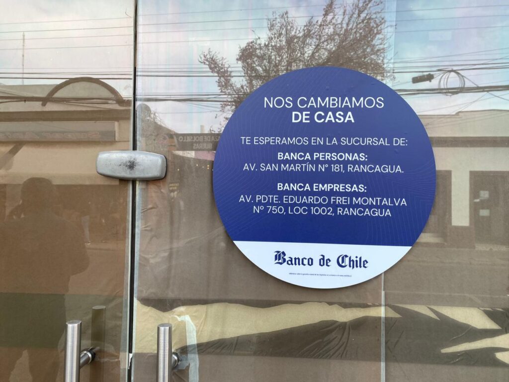 El Banco de Chile cerró las puertas de su sucursal de calle Coronel Santiago Bueras en Rancagua, medida que ya se reflejó con el aviso instalado en el acceso principal del recinto.
