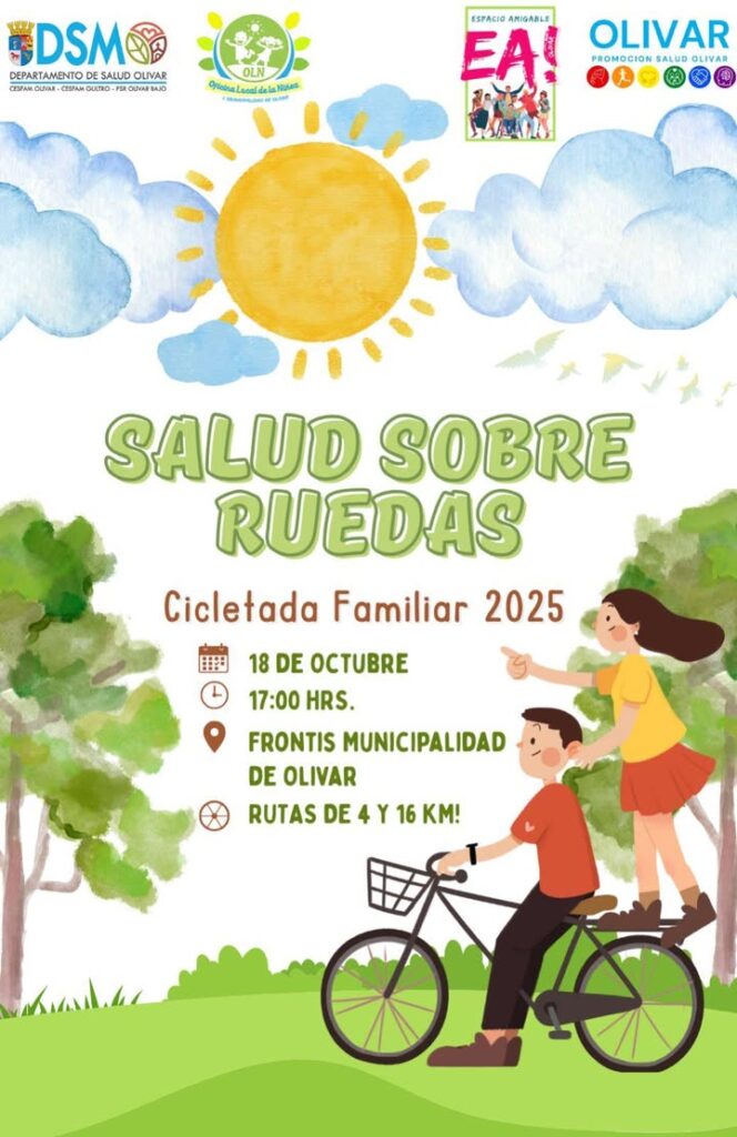 El próximo sábado 18 de octubre de 2025, a partir de las 17:00 horas, se llevará a cabo en Olivar la cicletada familiar “Salud sobre ruedas”, una actividad abierta a toda la comunidad que busca promover la vida saludable y la recreación al aire libre.
