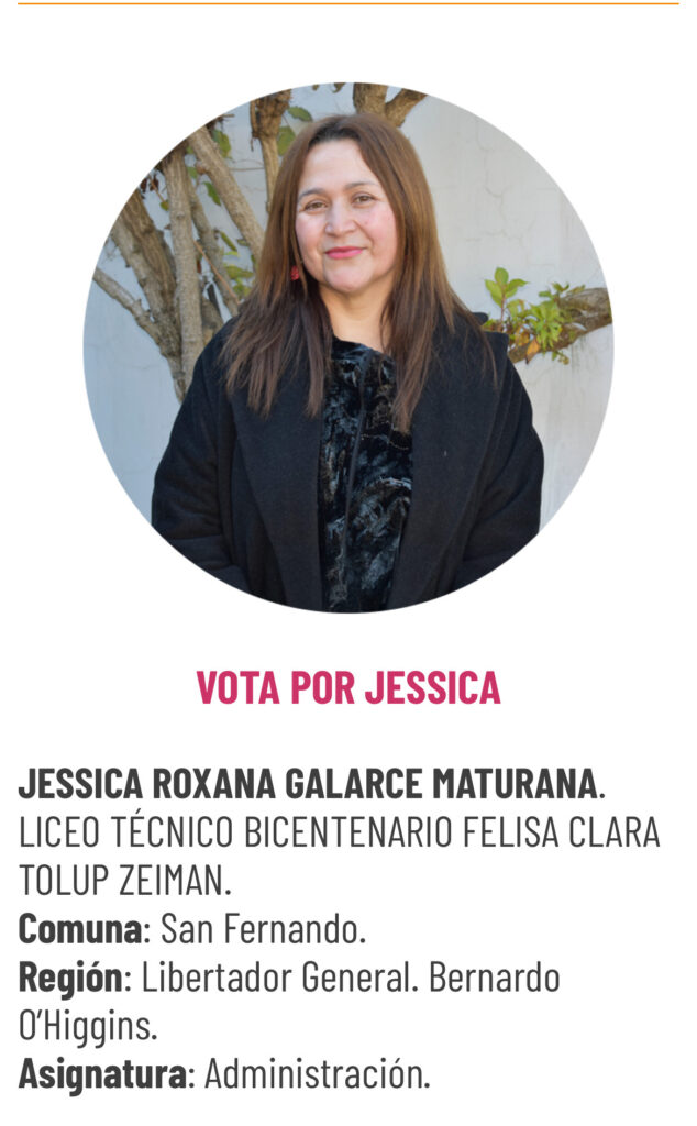 La profesora Jessica Galarce Maturana, del Liceo Bicentenario Técnico Felisa Clara Tolup Zeiman de San Fernando, figura entre los cinco finalistas del Premio Nacional Profesor Bicentenario 2025, reconocimiento impulsado por la Fundación Piñera Morel, Fundación Futuro, la Universidad del Desarrollo y Emol para destacar a los docentes más sobresalientes de la red de Colegios y Liceos Bicentenario de Excelencia del país.