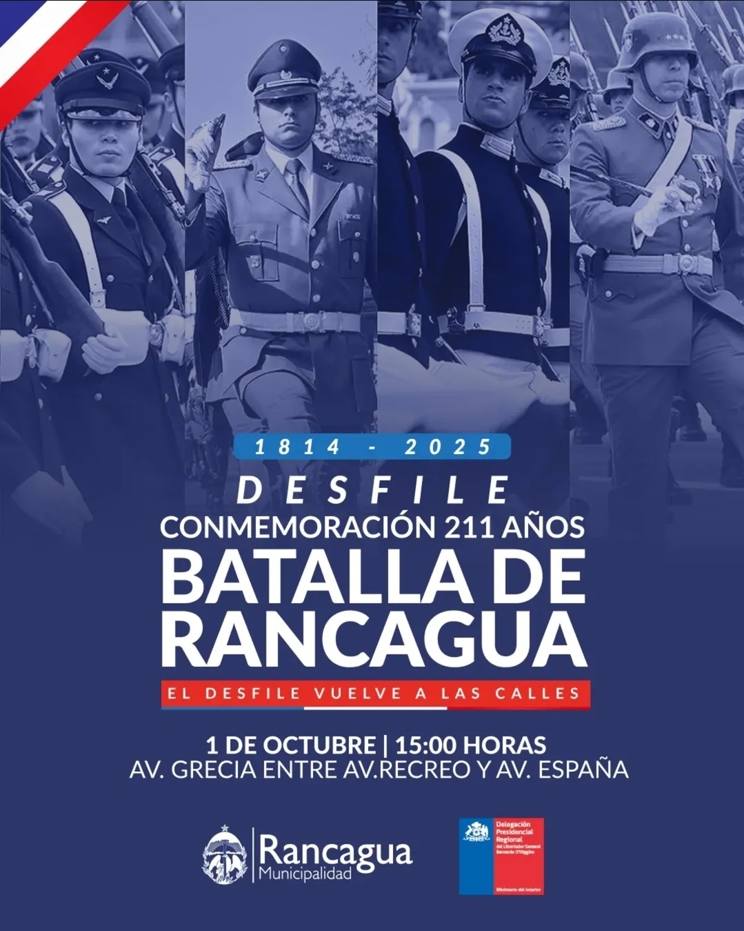 A partir de las 15:00 horas se llevará a cabo oficialmente el tradicional Desfile de Rancagua, actividad que este año conmemora los 211 años de la Batalla de Rancagua y que congregará a más de 2.000 participantes, entre instituciones militares, escolares y organizaciones civiles.