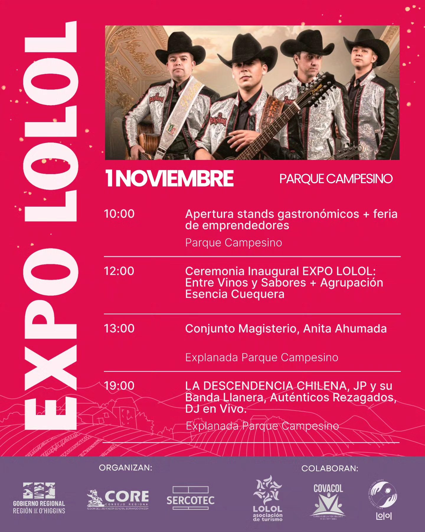 Este sábado 1 de noviembre se realizará una nueva versión de la Expo Lolol 2025, evento que tendrá lugar en el Parque Campesino desde las 10:00 horas y que promete una jornada llena de tradición, música y sabor local.