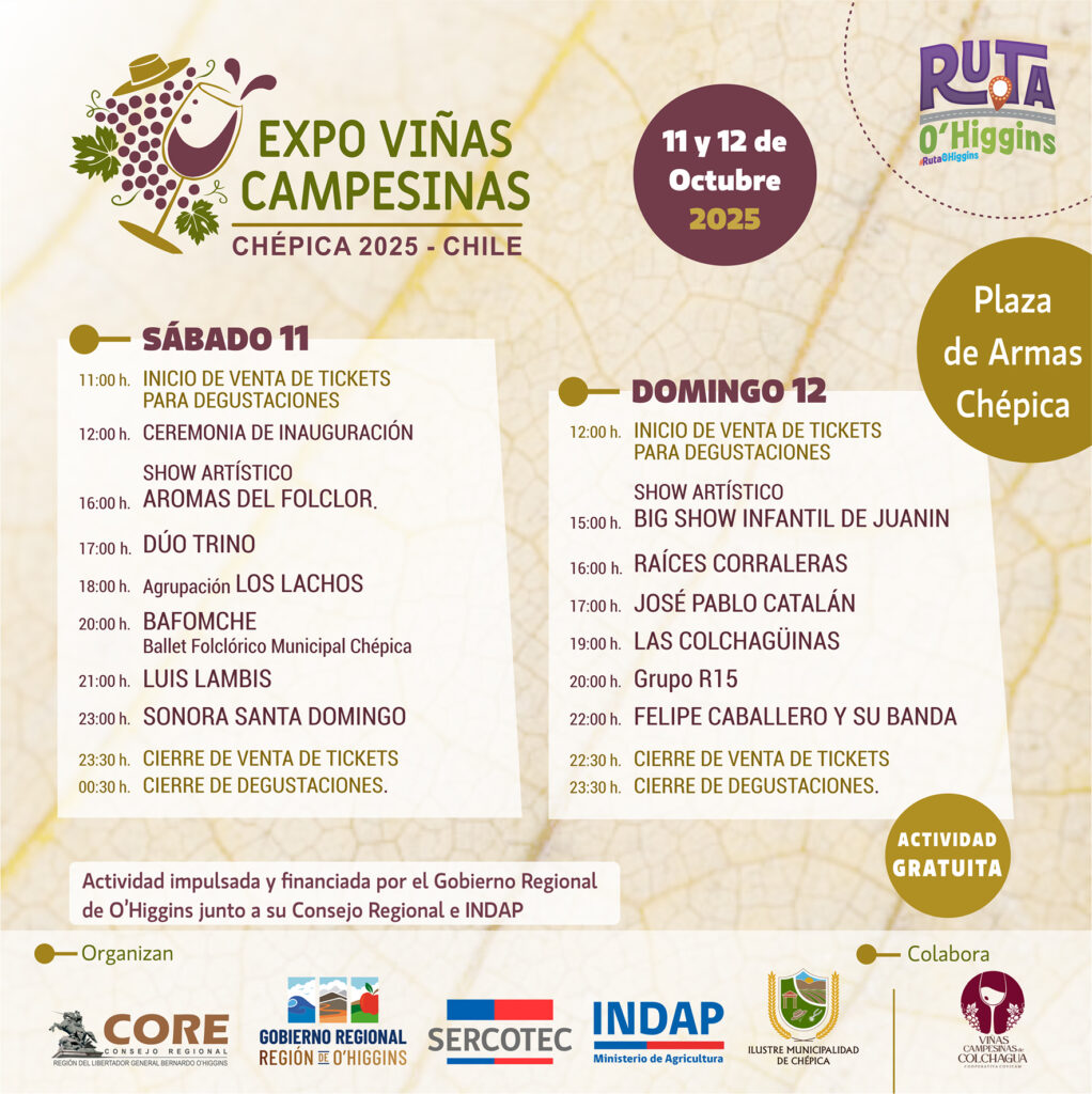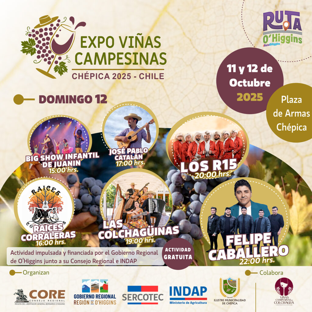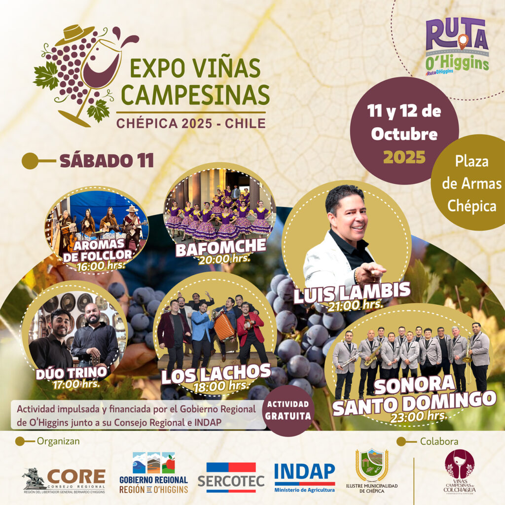 El 11 y 12 de octubre, la Plaza de Armas de Chépica será el epicentro de una fiesta única que celebra el folclor, la gastronomía local y el trabajo de las viñas campesinas. Una experiencia imperdible organizada por el Gobierno Regional de O’Higgins y diversas instituciones.