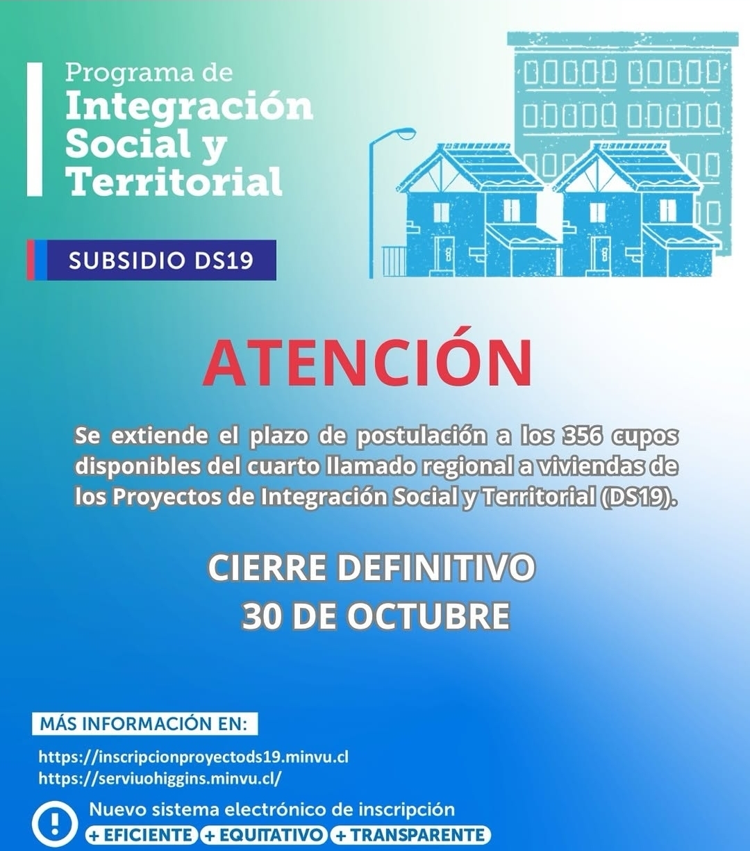El próximo jueves 30 de octubre se cerrará el proceso de postulación al cuarto llamado regional de los proyectos de Integración Social y Territorial (DS19) del MINVU O’Higgins, que contempla un total de 356 cupos disponibles.