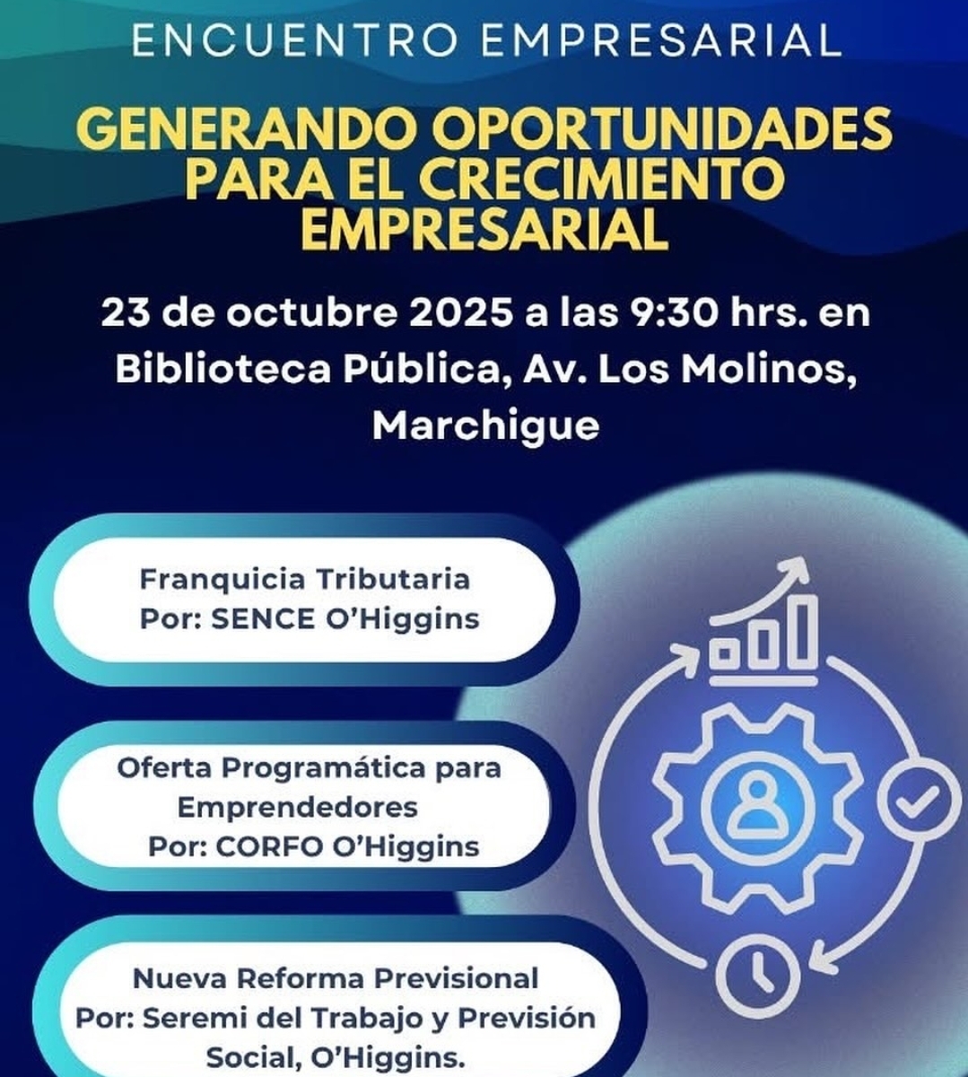 Desde las 9:30 horas de este jueves 23 de octubre, la Biblioteca Pública de Marchigüe será el punto de encuentro para emprendedores, pequeños empresarios y representantes del mundo público y privado, quienes participarán del Encuentro Empresarial Red OMIL Cardenal Caro 2025, en el marco de la Semana de MiPymes y Cooperativas.