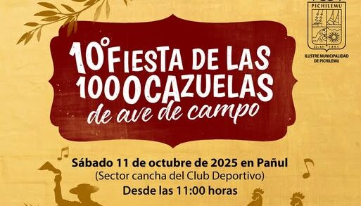 La localidad de Pañul, en Pichilemu, será escenario de la décima versión de la Fiesta de las 1000 Cazuelas de Ave de Campo, que se realizará el sábado 11 de octubre de 2025, en el sector de la cancha del Club Deportivo.