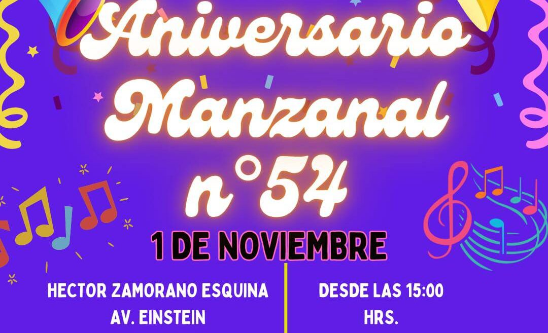 Este sábado 1 de noviembre, la Población Manzanal de Rancagua celebrará su aniversario número 54 con una gran fiesta abierta a toda la comunidad, organizada por la Junta de Vecinos Manzanal y el Comité Plaza El Molino.