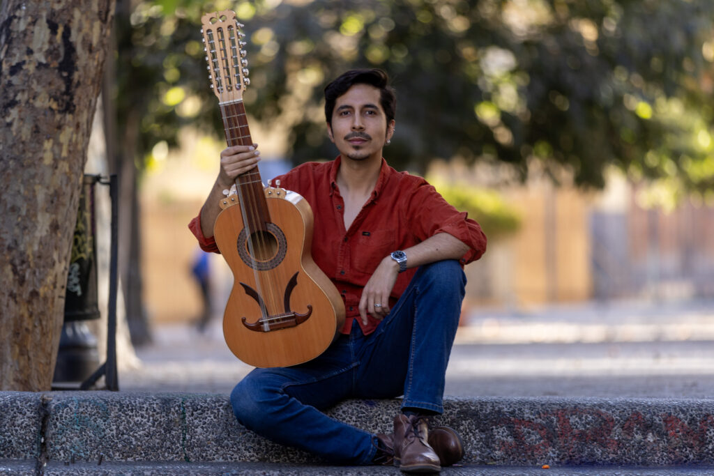 Francisco Rojas lleva como bandera la música tradicional de su tierra natal. Con guitarra y guitarrón chileno, compone e interpreta cuecas, tonadas y el canto a lo poeta.