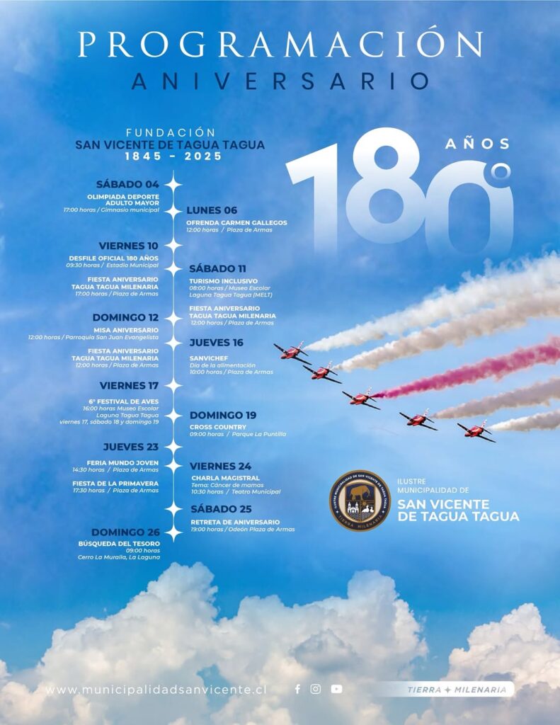 En el marco de la conmemoración de los 180 años de la fundación de San Vicente de Tagua Tagua, la Ilustre Municipalidad ha preparado una amplia y variada agenda de actividades que se extenderá durante todo el mes de octubre. Esta celebración, que marca un hito histórico para la comuna, tiene como objetivo principal resaltar la identidad local, fortalecer el sentido de pertenencia de los habitantes y generar un espacio de disfrute y participación para toda la comunidad.