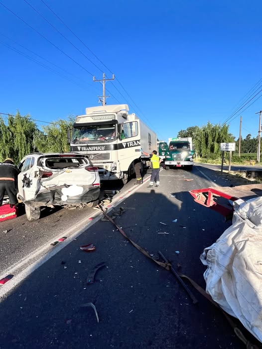 Durante la mañana de este viernes, alrededor de las 07:45 horas, equipos de emergencia acudieron a una colisión de alta energía registrada en la Ruta de la Fruta, kilómetro 16 , a la altura del Cruce La Virgen, en la comuna de San Vicente. El accidente involucró a tres vehículos menores y un camión.