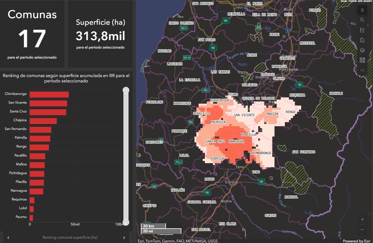 «Riesgo extremo de incendios forestales en 313,8 mil hectáreas. Las zonas más afectadas incluyen: Chimbarongo, San Vicente y Santa Cruz», señalaron desde la entidad en su cuenta de X.