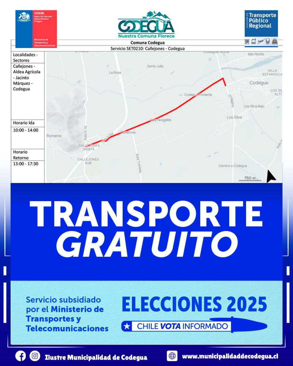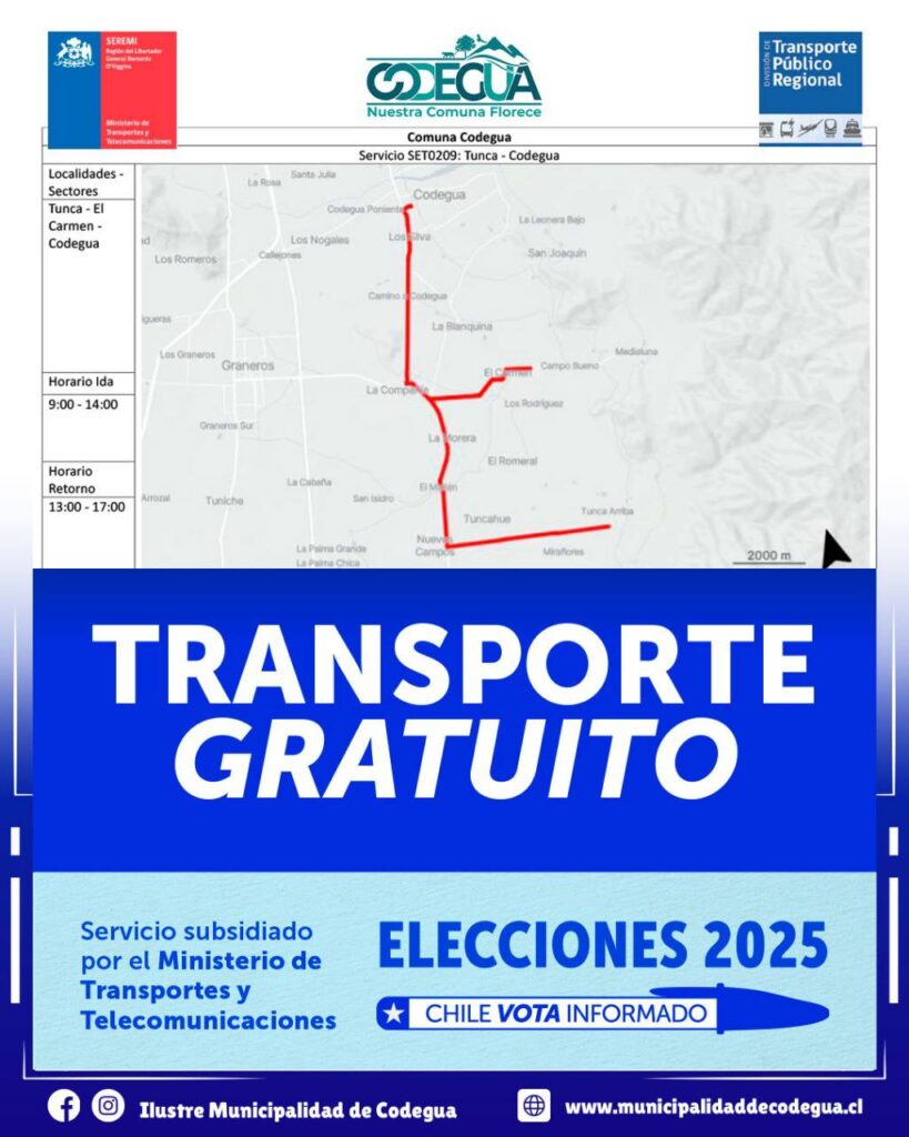 Este domingo 16 de noviembre se desarrollarán las Elecciones Presidenciales y Parlamentarias 2025. Ante esto, la Municipalidad de Codegua confirmó que contará con recorrido de buses de acercamiento con el objetivo de facilitar la participación de la comunidad en el proceso electoral.