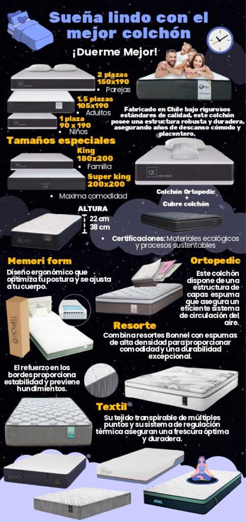 En el mercado chileno, la oferta de colchones se ha diversificado enormemente. Desde los modelos de resortes tradicionales hasta los de espuma viscoelástica y los híbridos, cada tecnología responde a un tipo de necesidad.