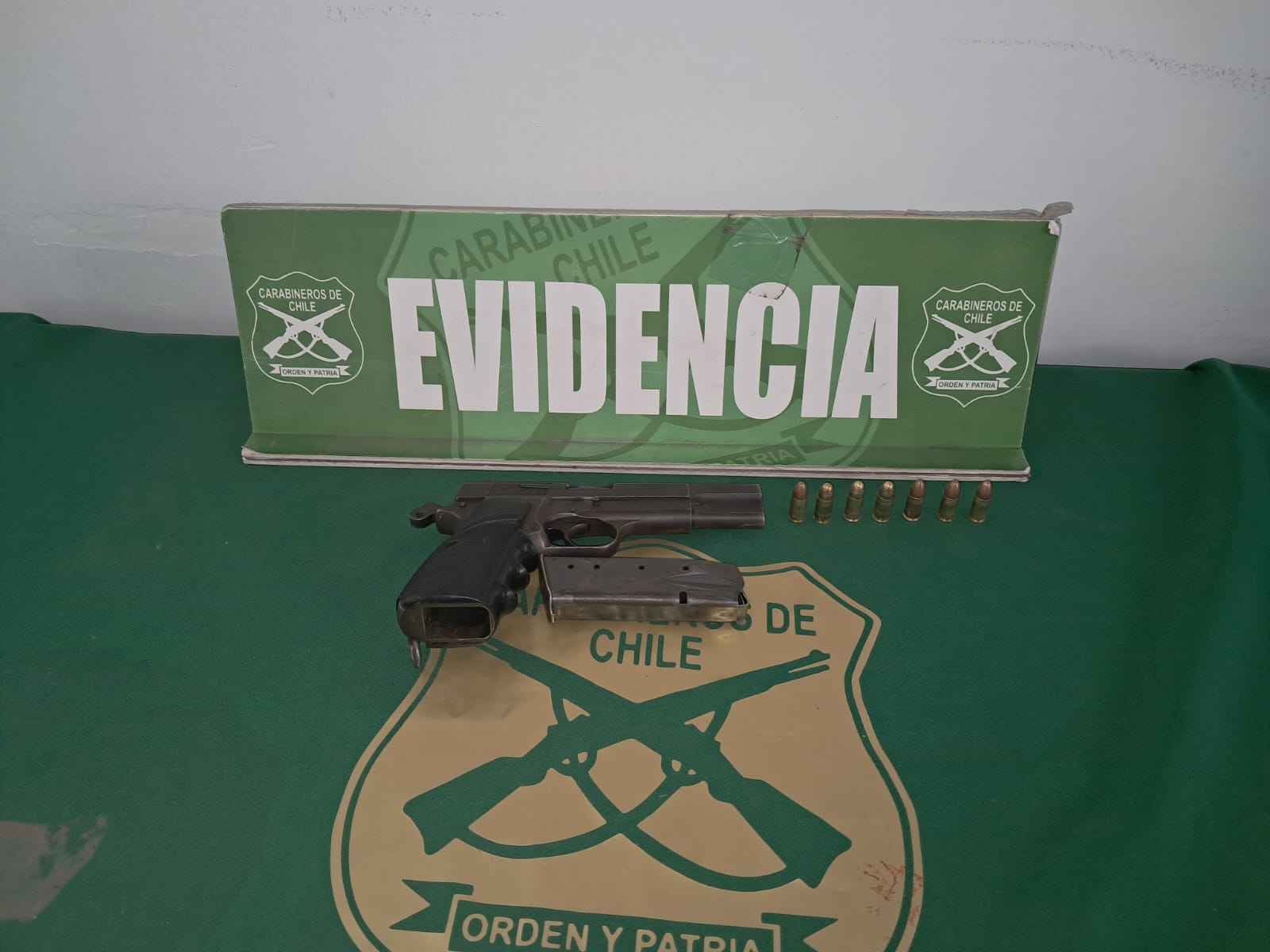 Además, en las diligencias realizadas en el sitio, Carabineros halló una pistola sin marca visible, con la inscripción “Policía Federal de Argentina”, y un cargador con siete balas calibre 9 mm. Tanto el arma como la munición fueron incautadas.