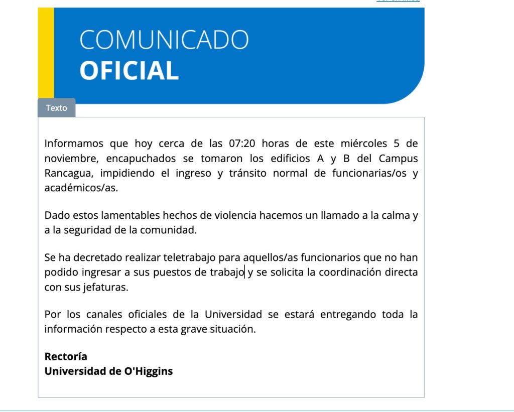 Durante la mañana de este miércoles, la Universidad de O’Higgins informó que un grupo de encapuchados se tomó los edificios A y B del Campus Rancagua, impidiendo el ingreso y tránsito normal de académicos y funcionarios.