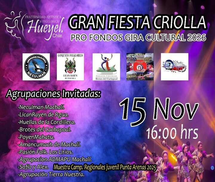 La jornada tiene como propósito reunir fondos para la Gira Cultural 2026 de la Fraternidad Artística y Folclórica Hueyel Chile, y contará con la participación de diversas agrupaciones de la Región de O’Higgins, que se darán cita para compartir sus presentaciones en un ambiente familiar y festivo.