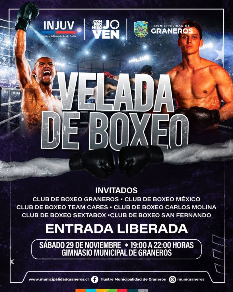 Graneros vivirá el sábado 29 de noviembre una noche marcada por la energía del deporte de contacto, con la realización de una nueva Velada de Boxeo en el Gimnasio Municipal de la comuna. La actividad, programada entre las 19:00 y las 22:00 horas, reunirá a destacados clubes locales y regionales que llegarán a competir y exhibir su nivel sobre el cuadrilátero.