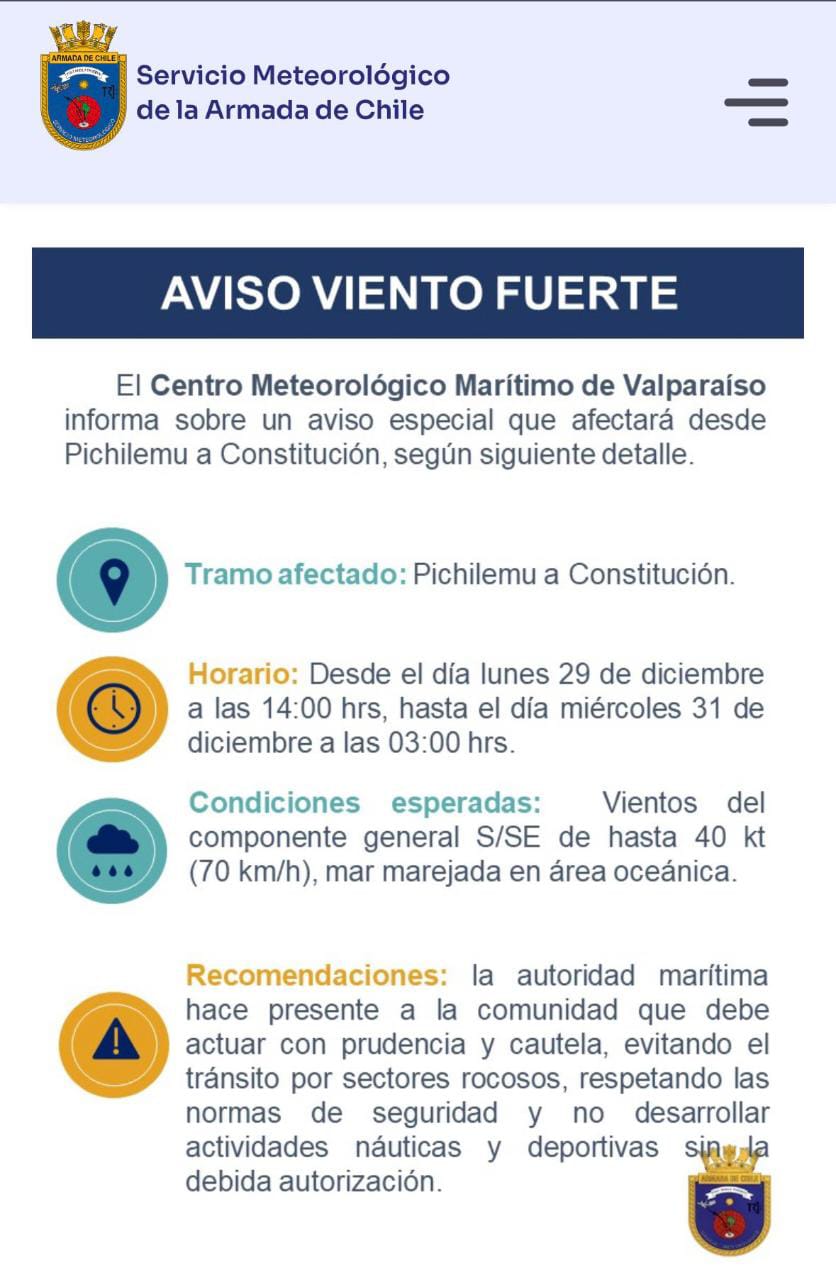 El Centro Meteorológico Marítimo de Valparaíso emitió un aviso especial que afectará el tramo costero entre Pichilemu y Constitución, incluyendo gran parte de la región de O’Higgins. Según el pronóstico, desde este lunes 29 de diciembre se registrarán vientos de hasta 70 kilómetros por hora acompañados de marejadas en el área oceánica.