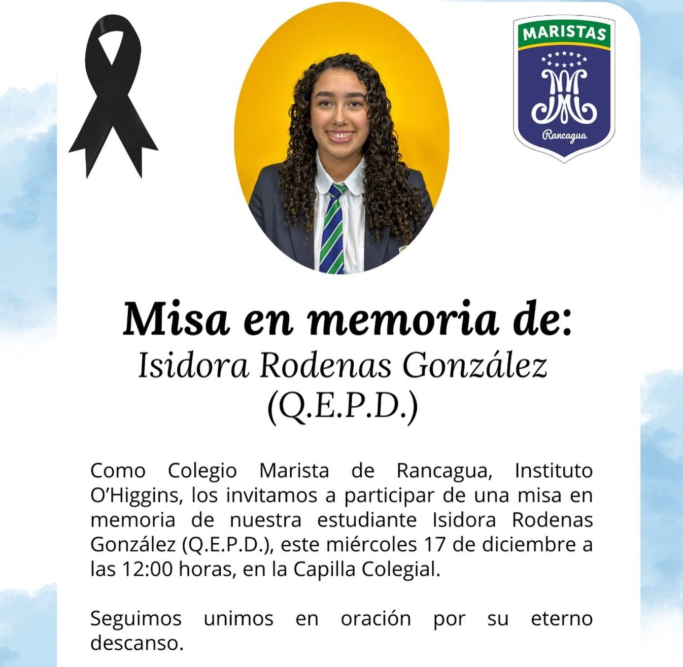 Durante la jornada del pasado lunes 15 de diciembre, el Colegio Marista de Rancagua informó el sensible fallecimiento de la estudiante de tercero medio A, Isidora Rodenas González, noticia que generó profundo pesar al interior de la comunidad educativa.