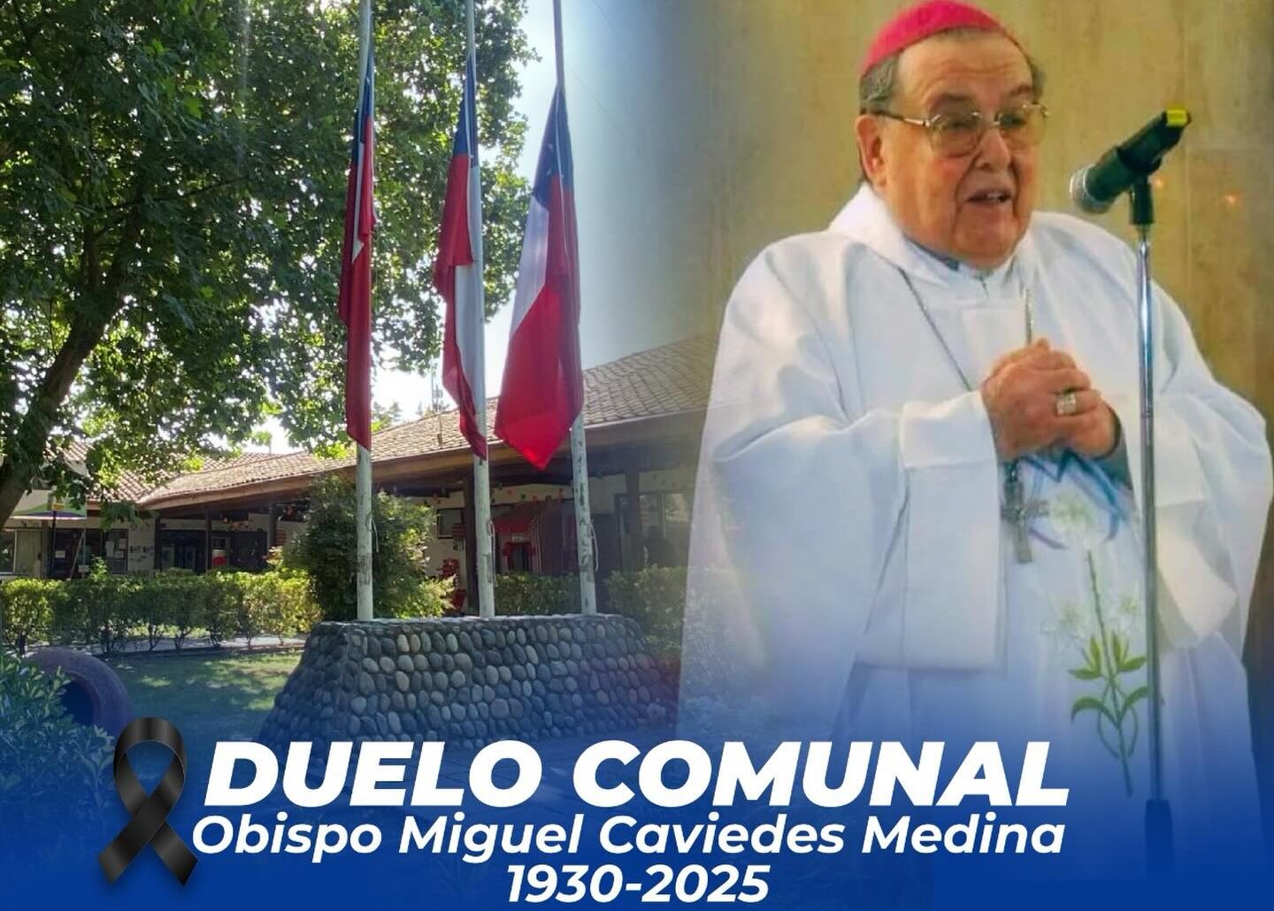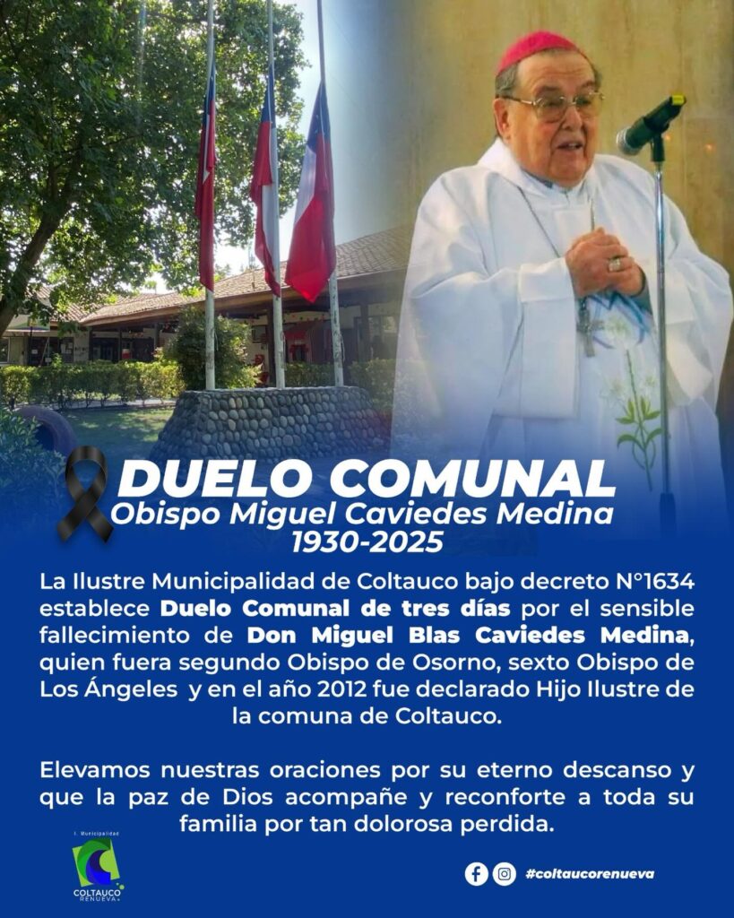El municipio de Coltauco decretó tres días de duelo comunal tras el fallecimiento de monseñor Miguel Blas Caviedes Medina, ocurrido a los 94 años. La decisión fue formalizada a través del Decreto N°1634, en reconocimiento a su trayectoria pastoral y a su estrecha relación con la comuna.