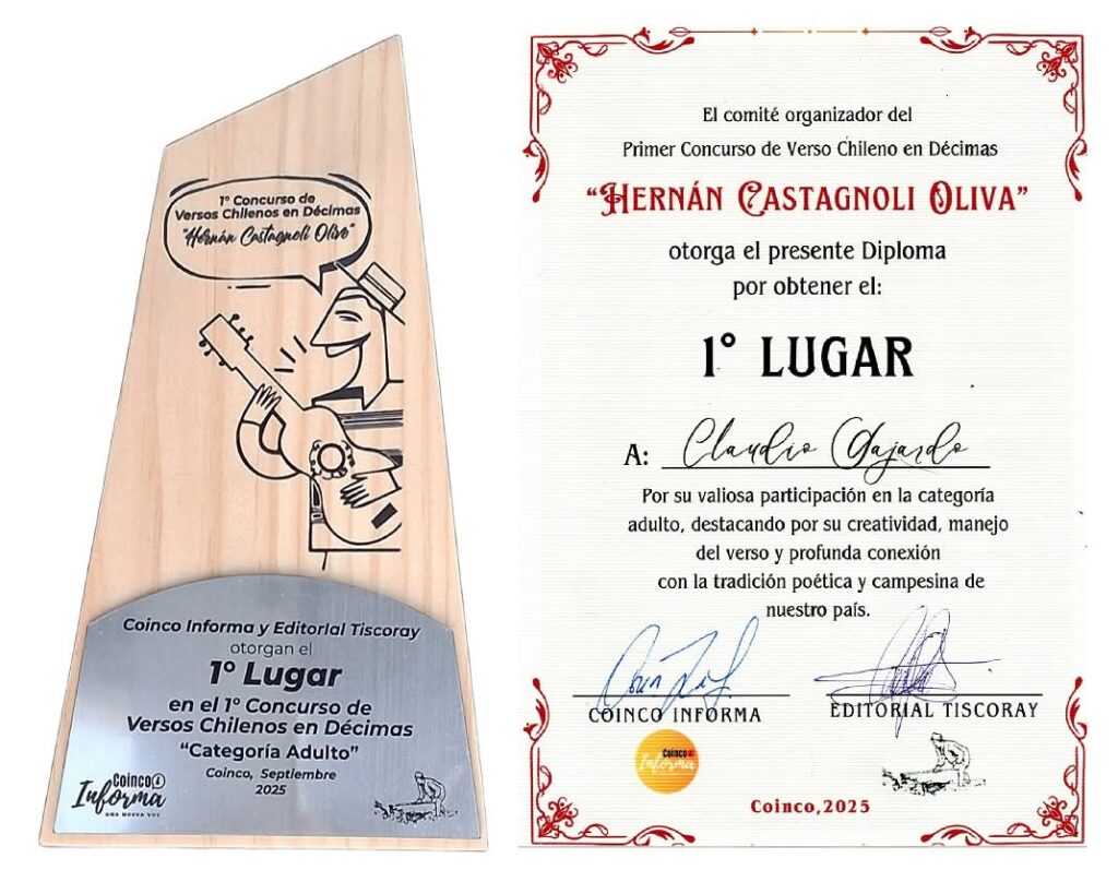 Claudio Gajardo, escritor santiaguino con ascendencia en San Vicente, viene de obtener el primer lugar en un concurso nacional de décimas organizado por la comuna de Coinco, certamen que convocó participantes desde Arica a Magallanes. “Jamás imaginé que iba a ganar el primer lugar, porque era un concurso a nivel nacional y con muy buena participación”, señaló el autor, quien presentó la décima titulada “En mi catre la enamoro”.