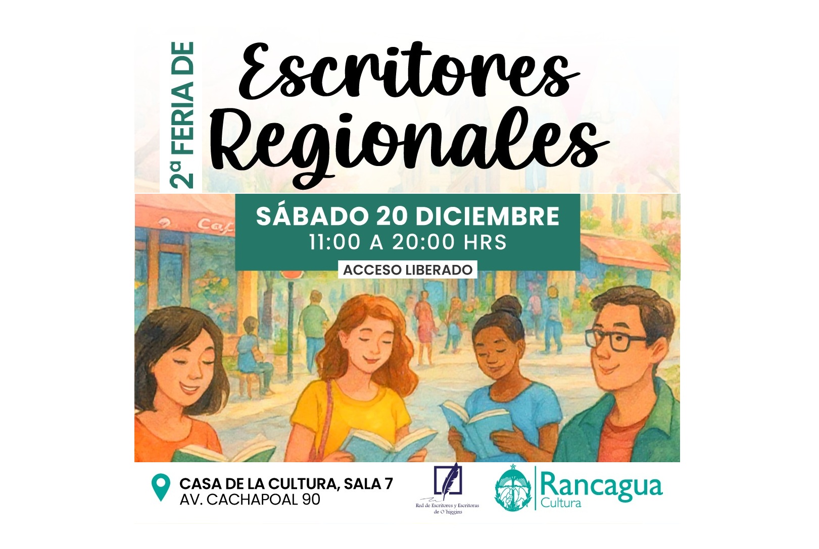Este sábado 20 de diciembre en la Casa de la Cultura, ubicada en Avenida Cachapoal 90, en Rancagua, se realizará la Segunda Feria de Escritores de O’Higgins desde las 11 hasta las 20 horas.