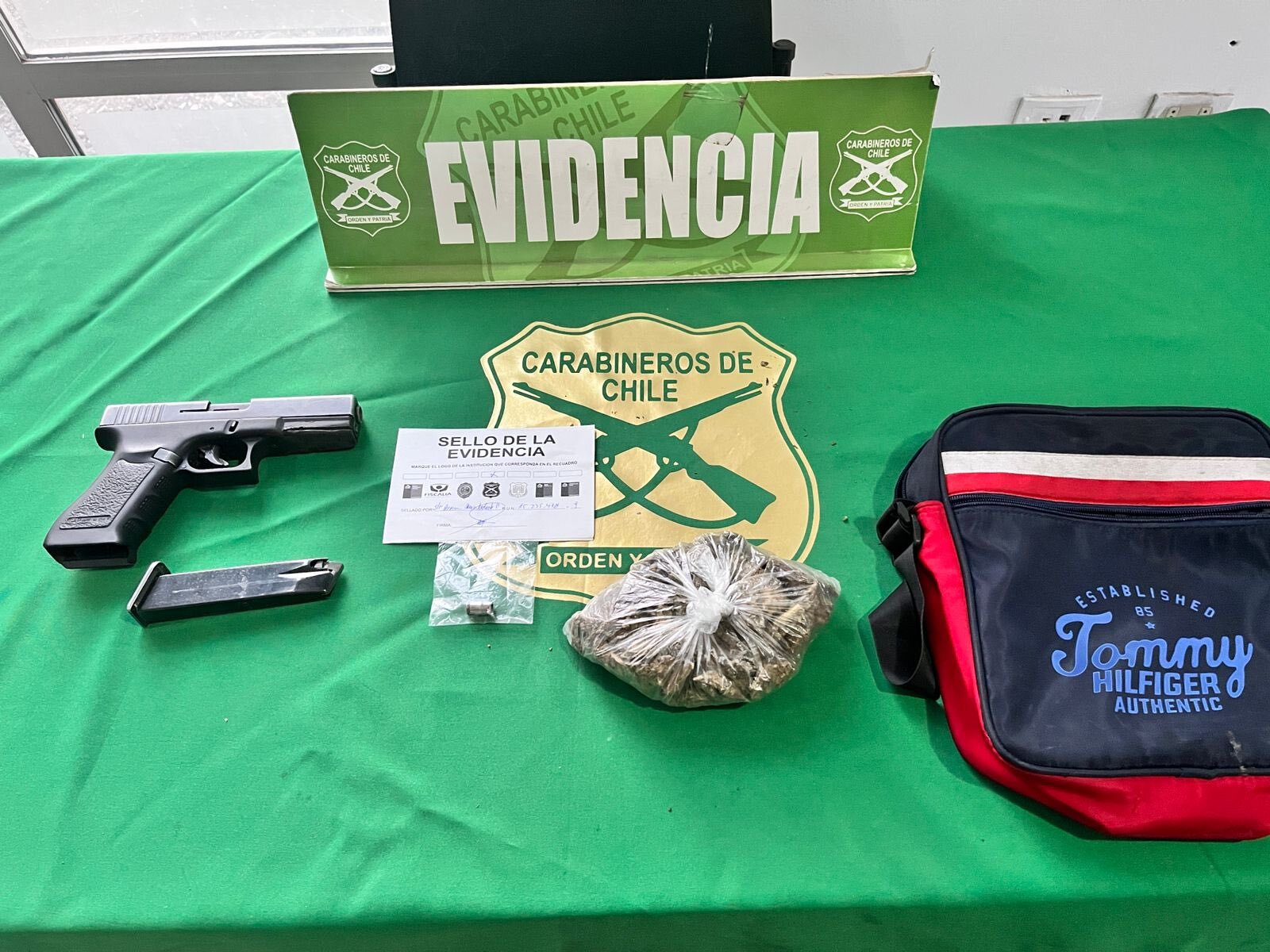 Durante el procedimiento, se incautaron 90 gramos de marihuana y una pistola a fogueo con cargador, sin munición, la que presentaba indicios de una posible modificación para el disparo.