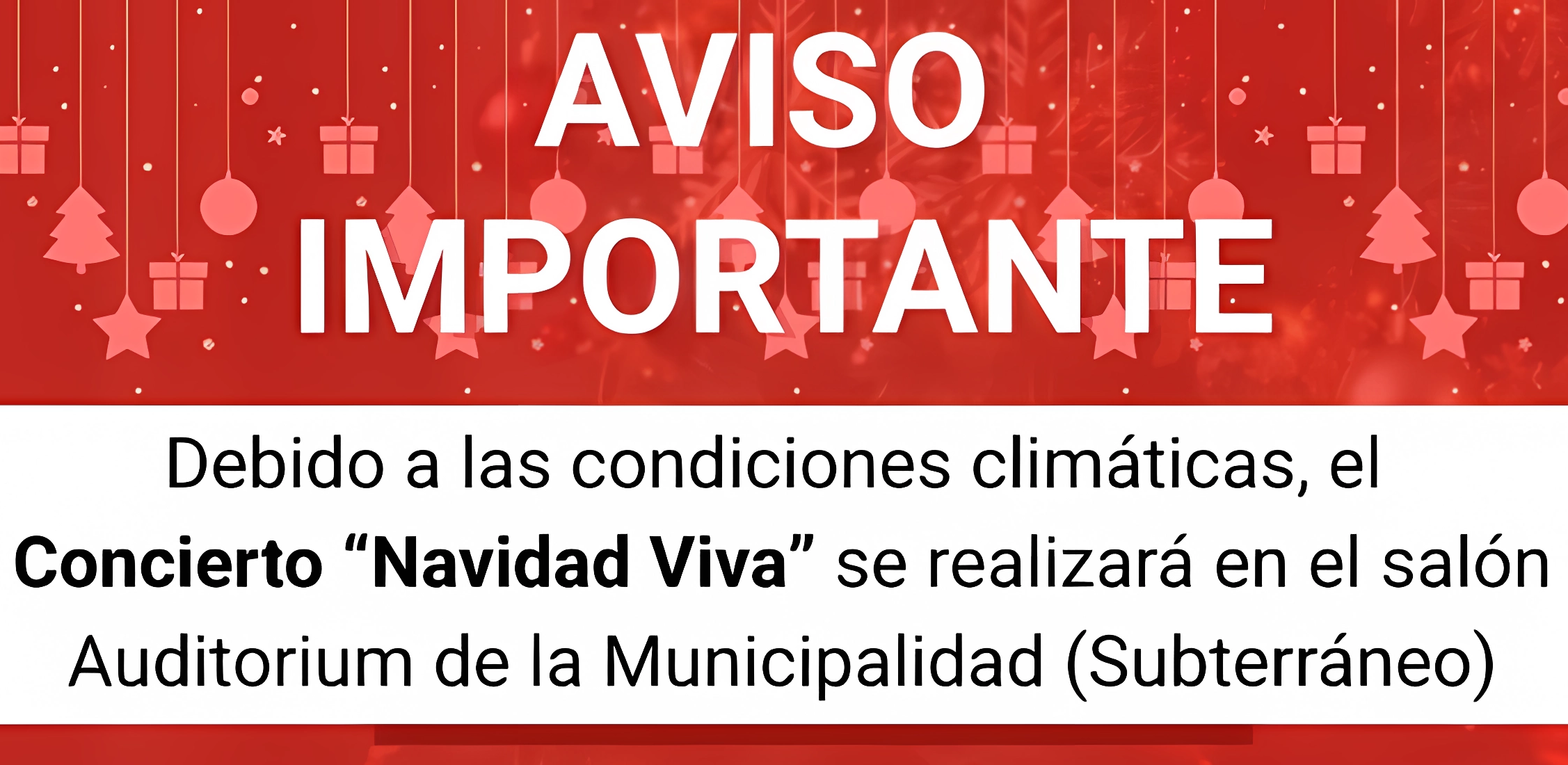 Debido a las condiciones climáticas pronosticadas para el final de esta jornada, la organización del concierto «Navidad Viva» ha confirmado el traslado de su ubicación. El evento, originalmente programado al aire libre en el Teatro Regional “Lucho Gatica”, se llevará a cabo hoy, sábado 20 de diciembre a las 20:00 horas, en el Salón Auditorio de la Municipalidad ubicado en el nivel subterráneo del edificio consistorial de la Plaza de Los Héroes.
