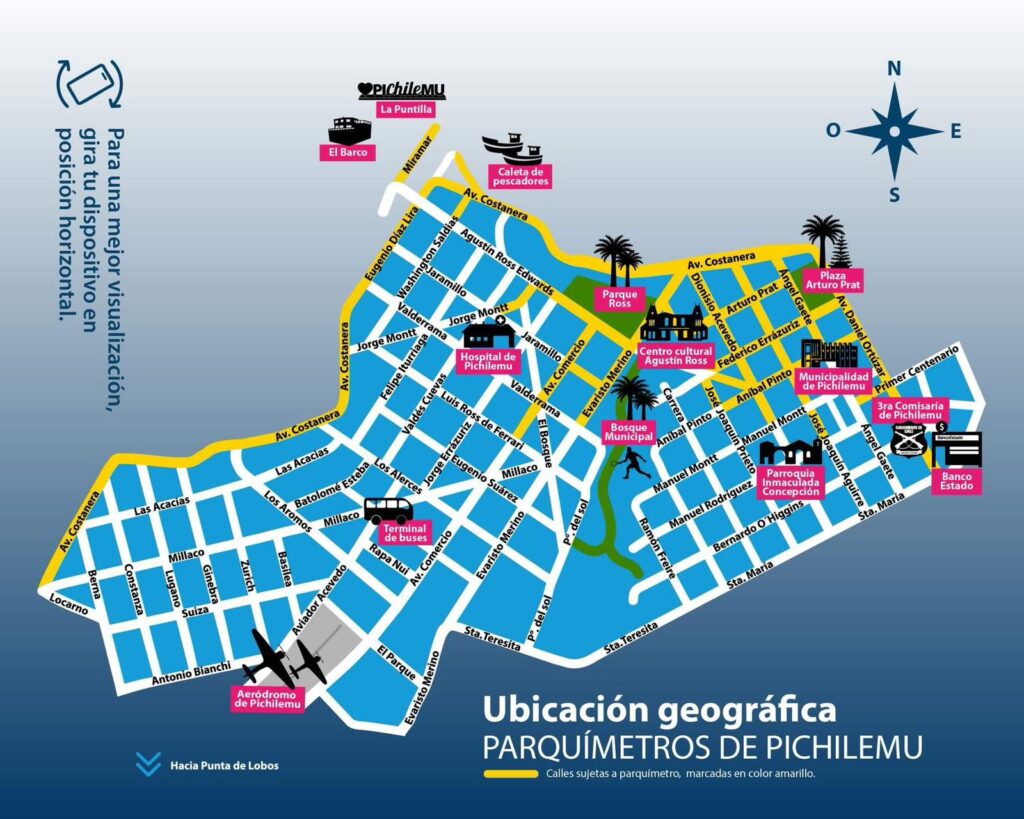 El municipio informó además que, de manera excepcional, a partir del 1 de enero de 2026 se sumarán nuevas calles al sistema, entre ellas Eugenio Díaz Lira —entre Agustín Ross y Valderrama por el costado derecho— y Avenida Costanera —entre Valderrama y Avenida Millaco, también por el costado derecho—. Para orientar a residentes y visitantes, la municipalidad dispuso un mapa general con el detalle de las zonas reguladas.