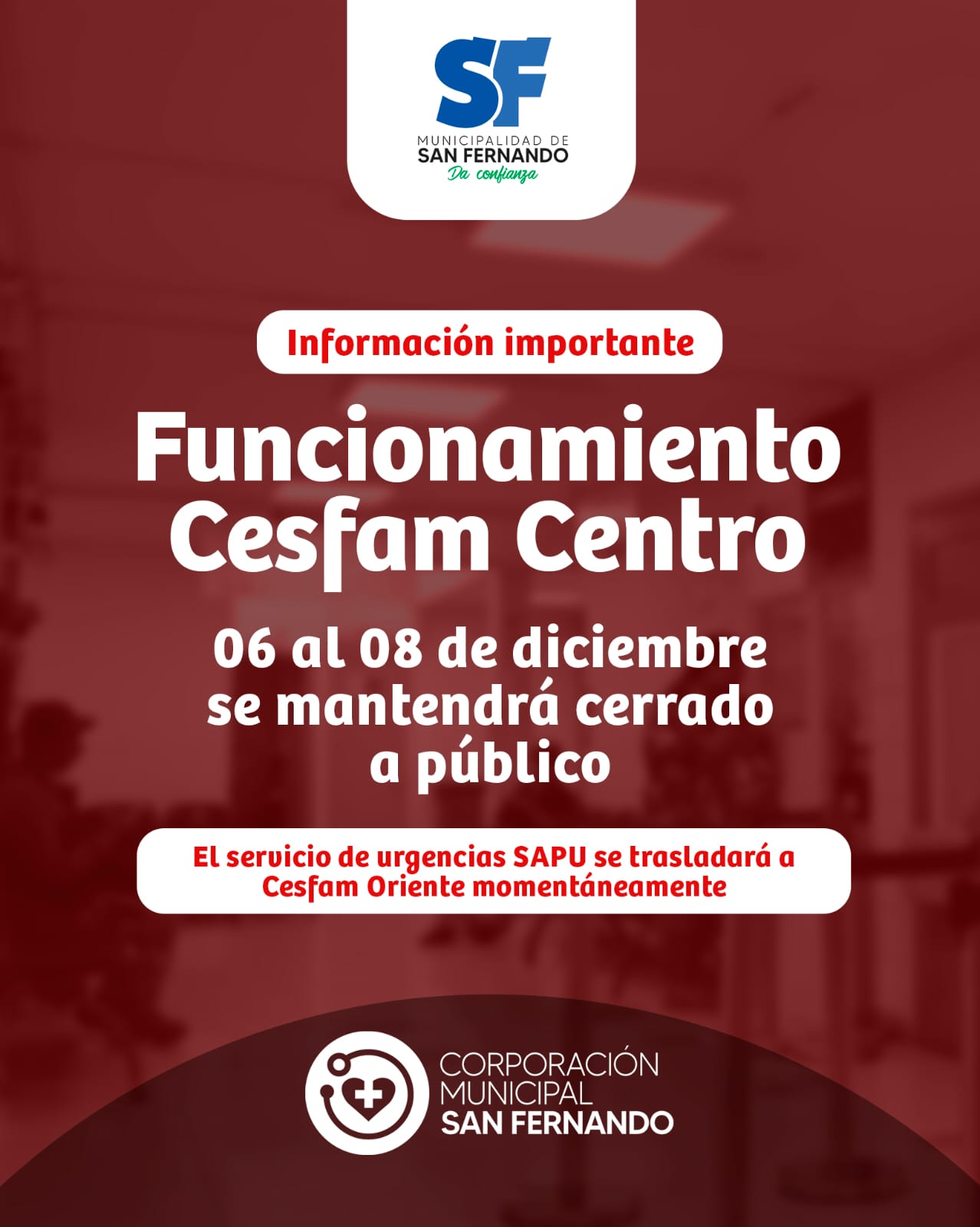 El Cesfam Centro de San Fernando informó a la comunidad que no atenderá público entre el 6 y el 8 de diciembre de 2025, esto debido a trabajos de mejoramiento en el sistema eléctrico del recinto que se desarrollarán durante esas fechas.