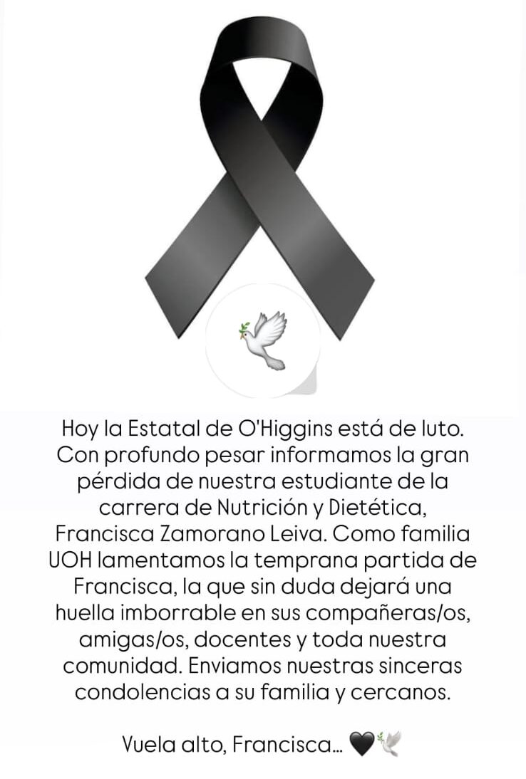 La Universidad de O’Higgins informó este lunes el luto institucional tras el fallecimiento de Francisca Zamorano Leiva, estudiante de la carrera de Nutrición y Dietética.