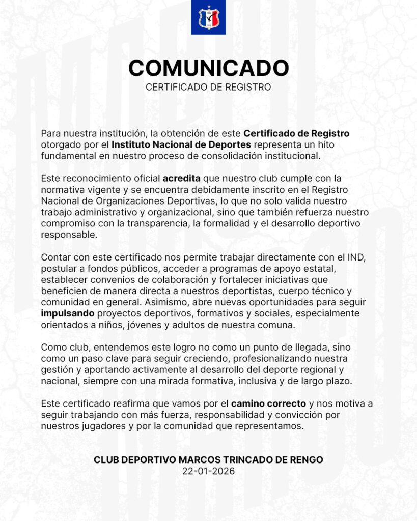 El Club Deportivo Marcos Trincado de Rengo informó que obtuvo el Certificado de Registro otorgado por el Instituto Nacional de Deportes (IND), documento que acredita su inscripción vigente en el Registro Nacional de Organizaciones Deportivas y el cumplimiento de la normativa actual.