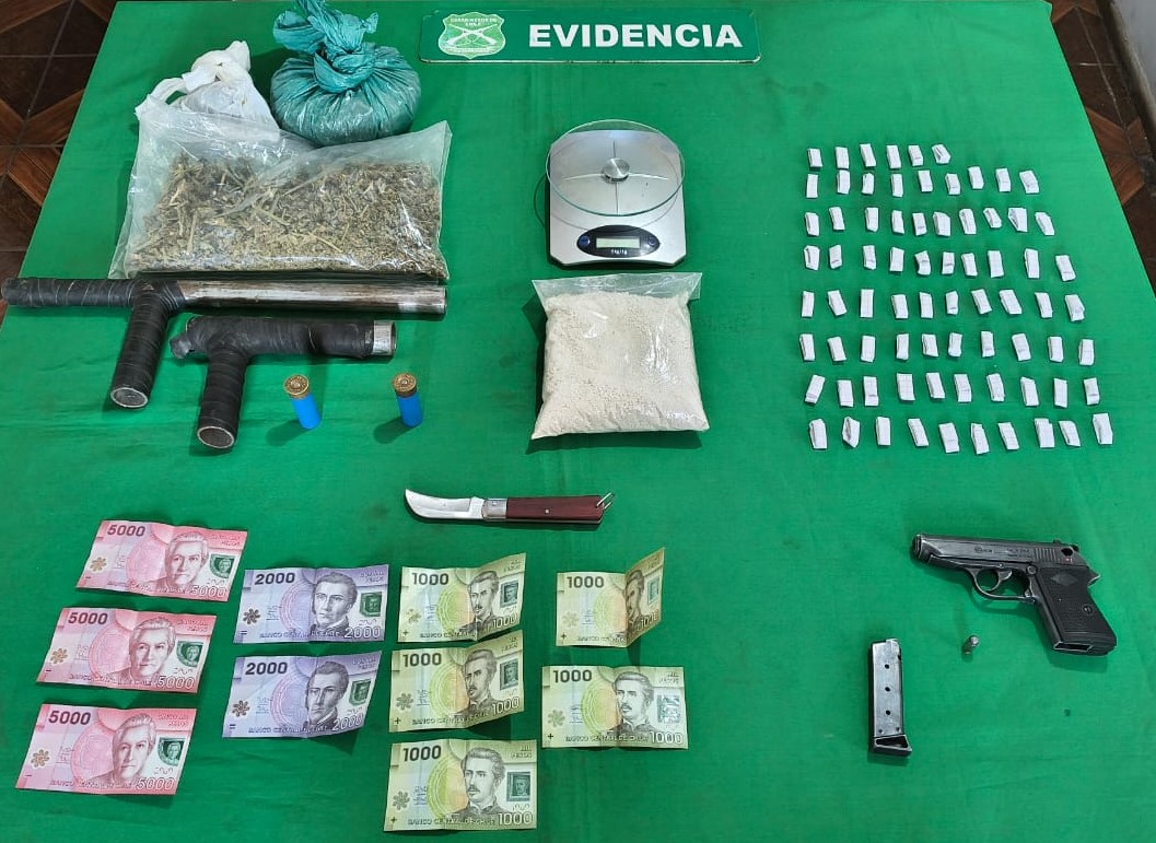 El subcomisario de Machalí, teniente Eduardo Fernández Camiruaga, señaló que “a simple vista se pudo constatar la existencia de una bolsa de pasta base, otra de marihuana, así como dinero en efectivo y una pistola marca new, cal. 9mm, con número de serie borrado, una escopeta de fabricación artesanal, un cartucho 9 mm; y dos cartuchos de escopeta cal. 12”