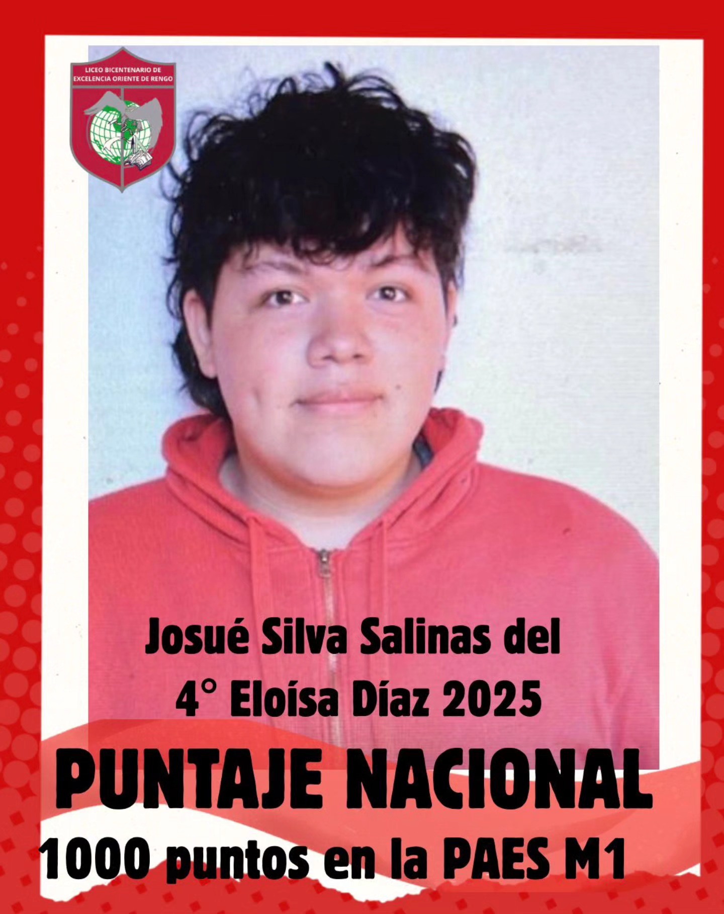 Se trata de Josué Silva Salinas, del 4° Eloísa Díaz generación 2025, quien logró el máximo puntaje a nivel nacional en esta evaluación, dejando al establecimiento entre los liceos de la Región de O’Higgins con resultados destacados en la reciente rendición del examen.