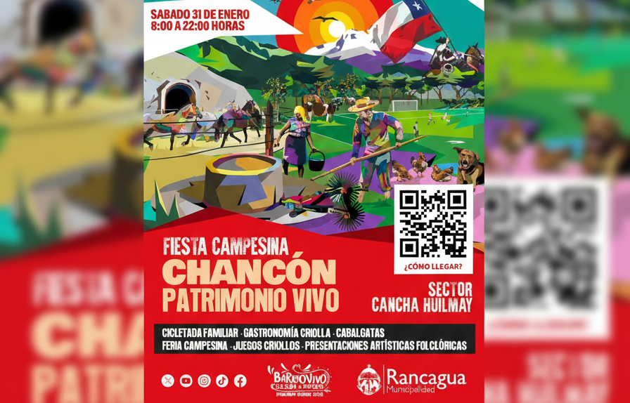 Rancagua se prepara para vivir la Fiesta Campesina “Chancón, Patrimonio Vivo”, un encuentro que integrará tradición, sabores y vida rural en un solo lugar. Este 31 de enero, desde las 08:00 hasta las 22:00 horas, la cancha Huilmay se llenará de familias, música y costumbres de la zona.