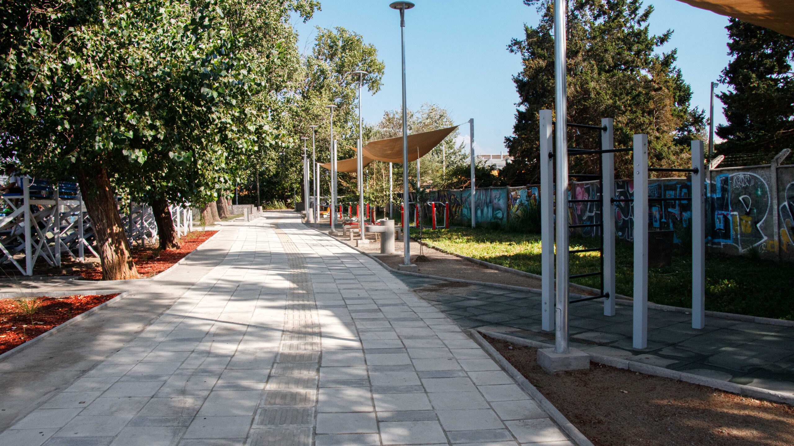 En tanto, la franja deportiva recupera el espacio ubicado entre la cancha del estadio y el cementerio, habilitando un sector seguro para usos recreativos, sociales y deportivos. El área incorpora equipamiento para ejercicio, mobiliario urbano, iluminación adecuada y un circuito peatonal perimetral con vegetación eficiente en consumo hídrico.