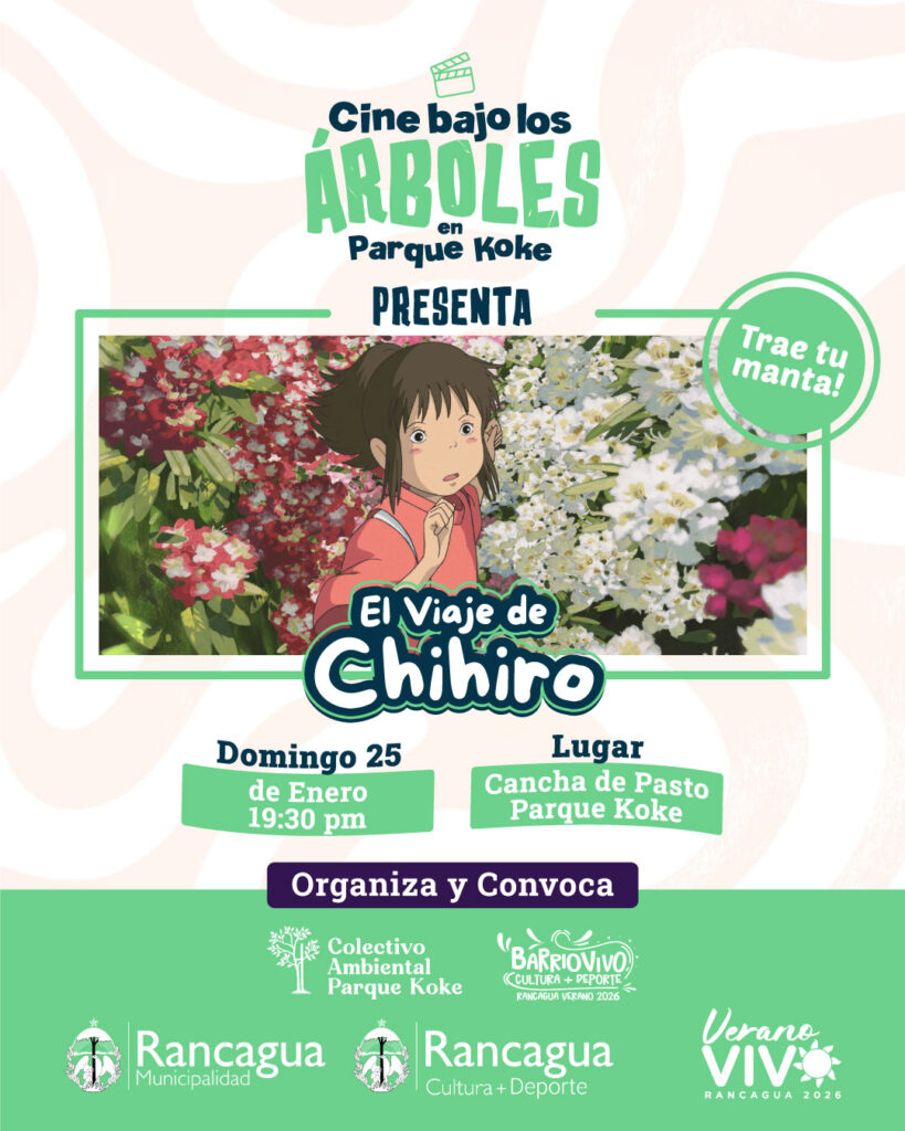 A las 20:00 horas se iniciará la proyección de “El Viaje de Chihiro” (2001), una de las películas más reconocidas de la animación japonesa contemporánea. La exhibición se realizará en la cancha de pasto del Parque Koke, con condiciones preparadas para una función al aire libre.