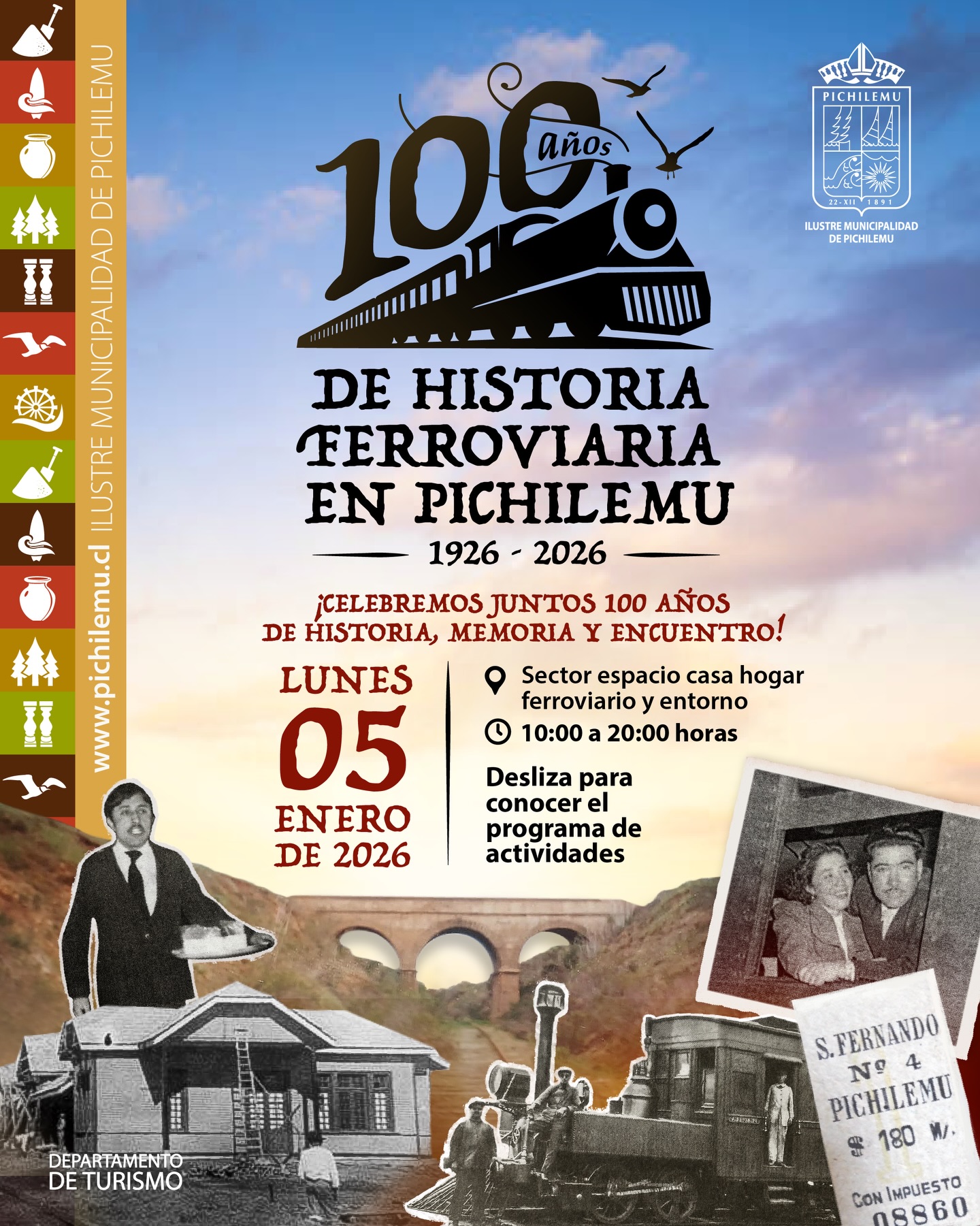 Pichilemu celebra este lunes 5 de enero el centenario de la llegada del tren a la comuna, con una serie de actividades abiertas a la comunidad entre las 10:00 y las 20:00 horas, en el sector de la Casa Hogar Ferroviario y su entorno. La jornada busca relevar la historia ferroviaria local y su impacto en el desarrollo del balneario.