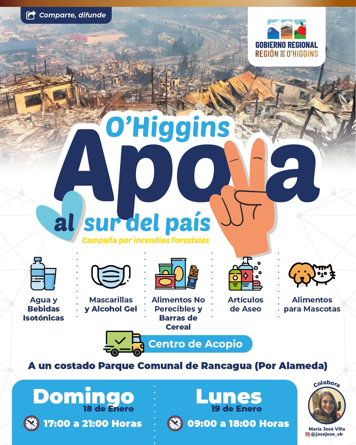 La iniciativa, denominada “O’Higgins apoya al sur del país”, tiene como objetivo recolectar agua y bebidas isotónicas, mascarillas y alcohol gel, alimentos no perecibles y barras de cereal, además de artículos de aseo y alimentos para mascotas.
