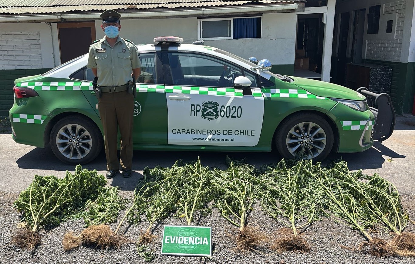 Un patrullaje de rutina en el sector Rinconada de Parral, Coltauco, terminó con la desarticulación de un cultivo ilegal de marihuana. Carabineros sorprendió a dos chilenos que mantenían 10 plantas de cannabis sativa —algunas de hasta 1,60 metros— ocultas al interior de un domicilio.