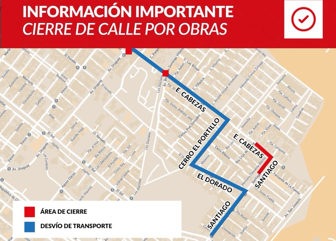 En cuanto a los desvíos, buses, camiones y locomoción colectiva deberán acceder por las calles El Dorado y Cerro El Portillo, siguiendo el plano de circulación establecido por el municipio.