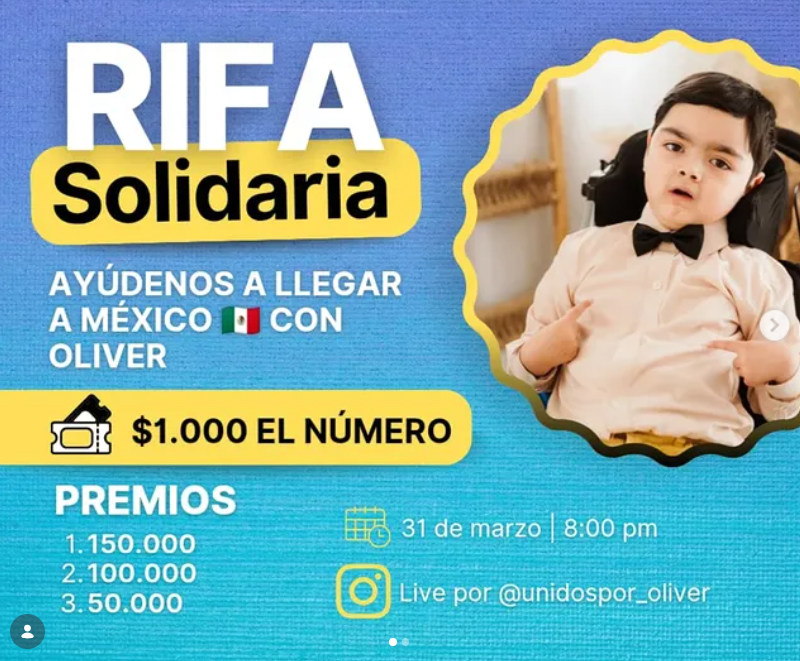 Actualmente, la familia se encuentra desarrollando una rifa solidaria, que ya está en venta, con el objetivo de reunir recursos para costear el tratamiento en el extranjero. Cada número tiene un valor de $1.000 y contempla premios de $150.000, $100.000 y $50.000. El sorteo se realizará el 31 de marzo a las 20:00 horas, a través de una transmisión en vivo en la cuenta de Instagram @unidospor_oliver.