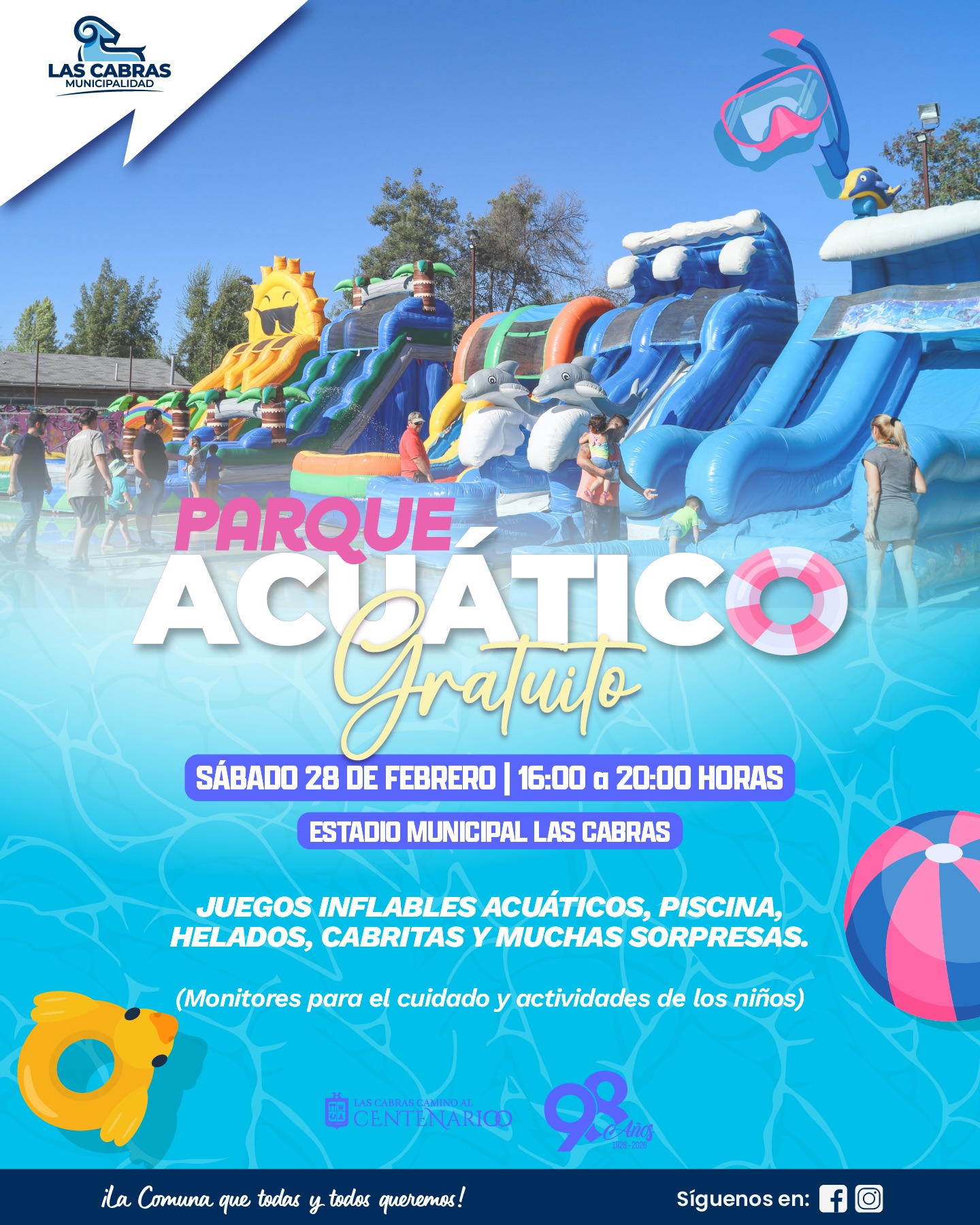 La Municipalidad de Las Cabras confirmó que este sábado 28 de febrero se realizará, de manera completamente gratuita, el Parque Acuático en el Estadio Municipal de Las Cabras Nibaldo Miranda Calderón.